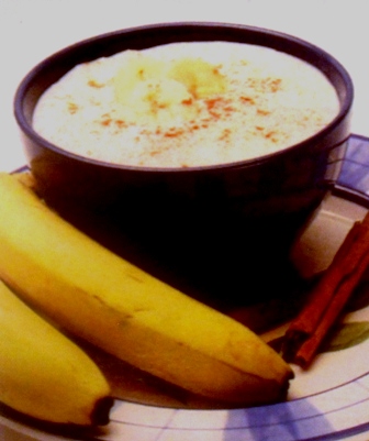 Corta el banano en trozos pequeños. Sirve el arroz en un cuenco y decóralo con el banano y una pizca de canela en polvo. |