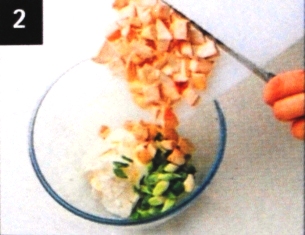 Con un cuchillo afilado, corta el pollo en dados, recorta los extremos de las cebolletas y córtalas en rodajas gruesas. Mezcla el pollo y la cebolleta con el queso cremoso o el requesón. |