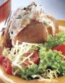 VARIACIÓN: Para otro delicioso relleno, fríe 9 onzas de champiñones pequeños con un poco de mantequilla. Mézclalos con el pollo y después añada onzas de yogurt natural, 1 cucharada de pasta de tomate y 2 cucharaditas de curry en polvo no muy picante. Mézclalo todo bien y rellena las papas.