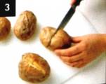Frota la piel de las papas para limpiarlas, y pínchalas con un tenedor por toda la superficie. Cuécelas en el horno precalentado a 200° C unos 50 minutos, hasta que estén tiernas, o bien ásalas en el microondas a temperatura alta, durante 12-15 minutos. |