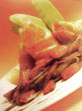 En la misma sartén, fríe el chile pimiento y la arveja, añade la piña y su almíbar, la salsa de ostras y la salsa de soja. Deja hervir aproximadamente un minuto. |